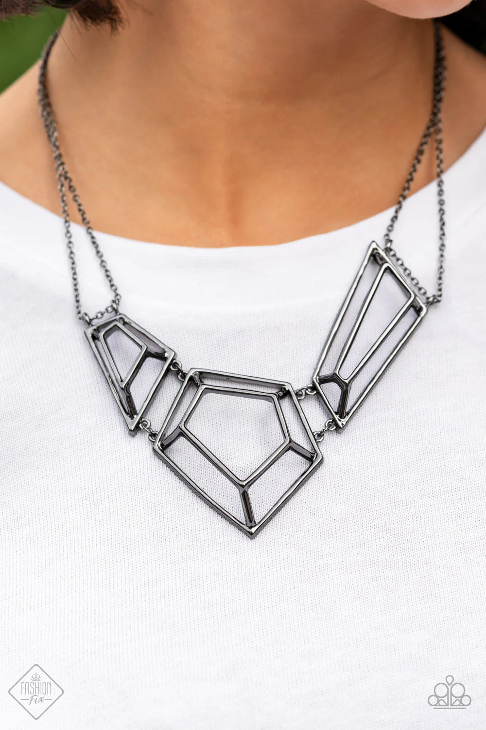 Glistening gunmetal bars connect into edgy 3-dimensional frames below the collar, creating a bold geometric statement piece. Features an adjustable clasp closure.