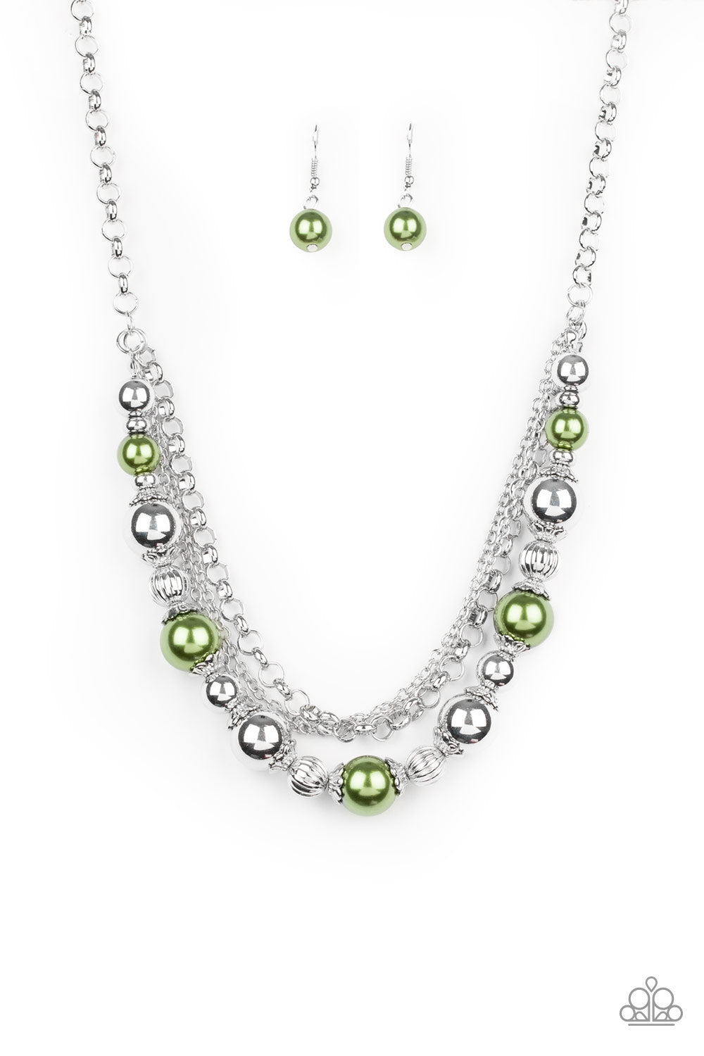 Layers of mismatched silver chains give way to a strand of ornate silver beads and oversized green pearls that cascade below the collar for a refined flair. Features an adjustable clasp closure.