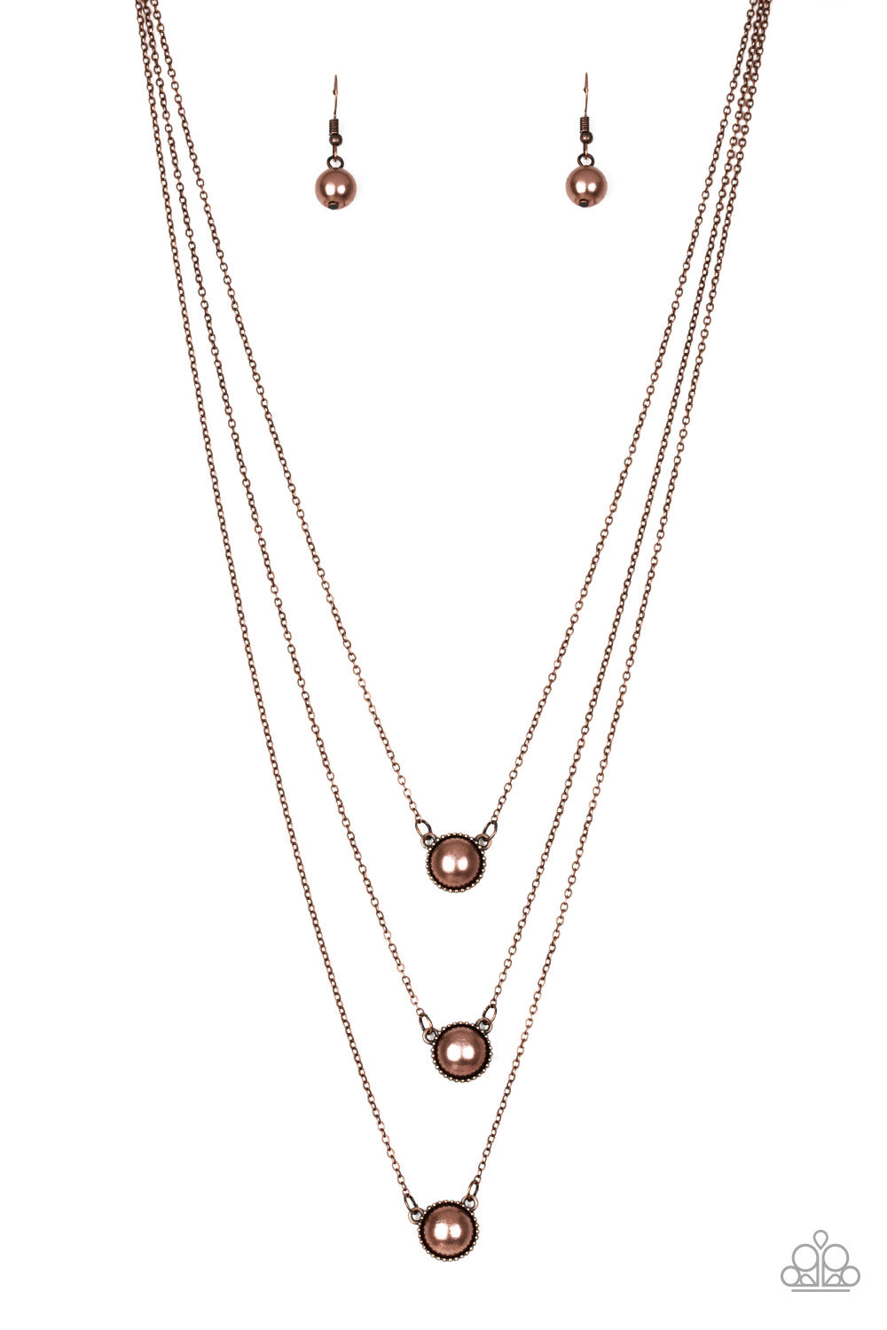 Three copper pearl drop pendants layer down the chest in a refined fashion. Features an adjustable clasp closure.