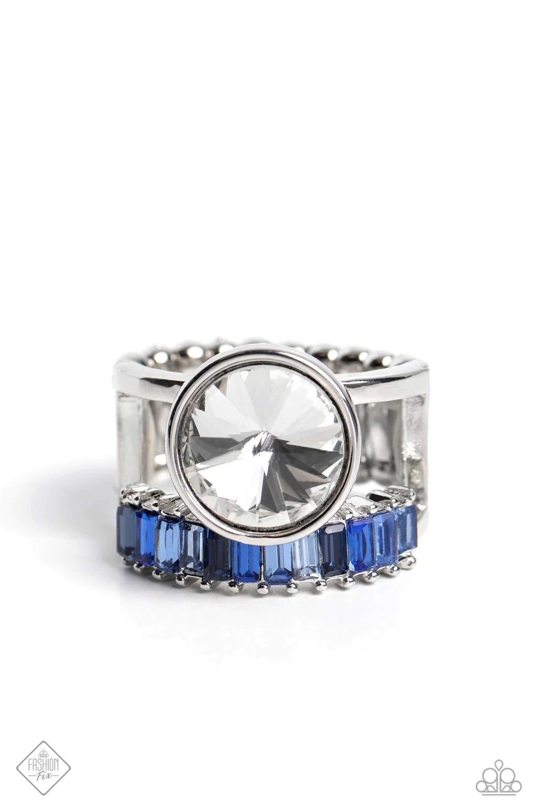 A row of glitzy, emerald-cut, blue rhinestones flares out from the bottom of an airy silver frame, while an oversized classic white gem crowns the top of the design, creating a smoldering statement piece atop the finger. Features a stretchy band for a flexible fit.