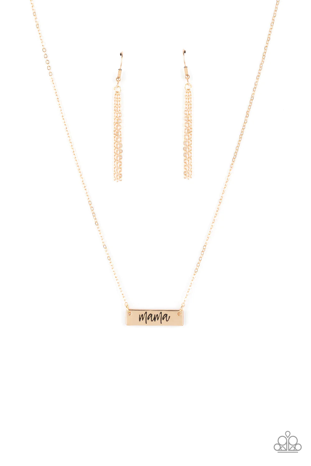 Stamped in the word, "Mama," a rectangular gold plate is suspended below the collar by a dainty gold chain, creating a whimsy inspirational pendant. Features an adjustable clasp closure.