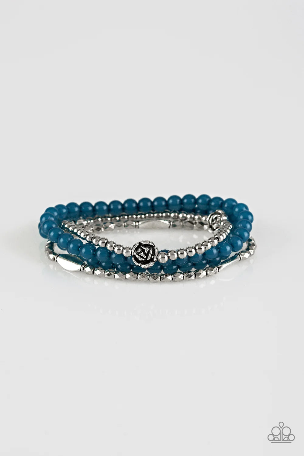 Mismatched silver beads and strands of glassy blue beads are threaded along stretchy bands. Infused with silver accents, dainty rose blossoms adorn the wrist for a seasonal finish.