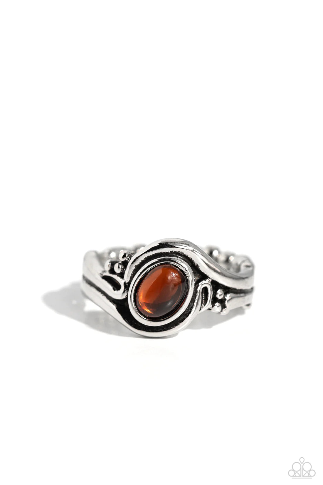 Infused with dainty studded accents, swooping silver bars nestle around a tilted glassy brown bead center for an enchanting finish. Features a dainty stretchy band for a flexible fit.
