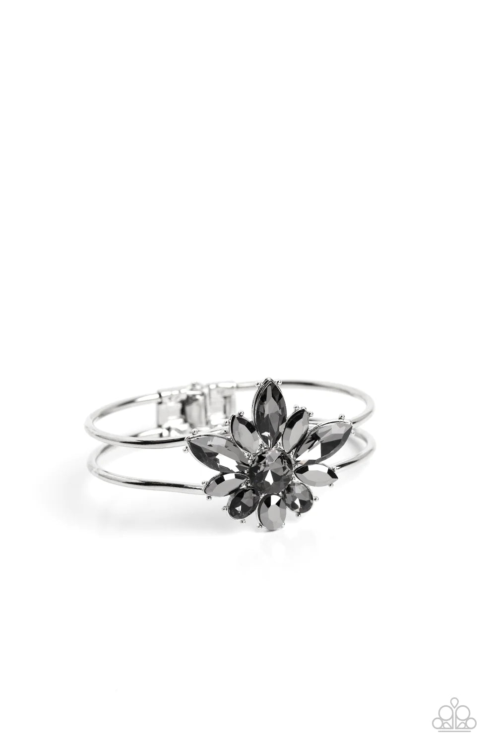 Varying sizes of oval and marquise-cut gems in hematite and smoky shades bloom around a round-brilliant cut center in a similar smoky hue. The dazzling collection of sparkly petals coalesces into a stunning floral centerpiece atop the wrist for a chic finish. Features a hinged closure.