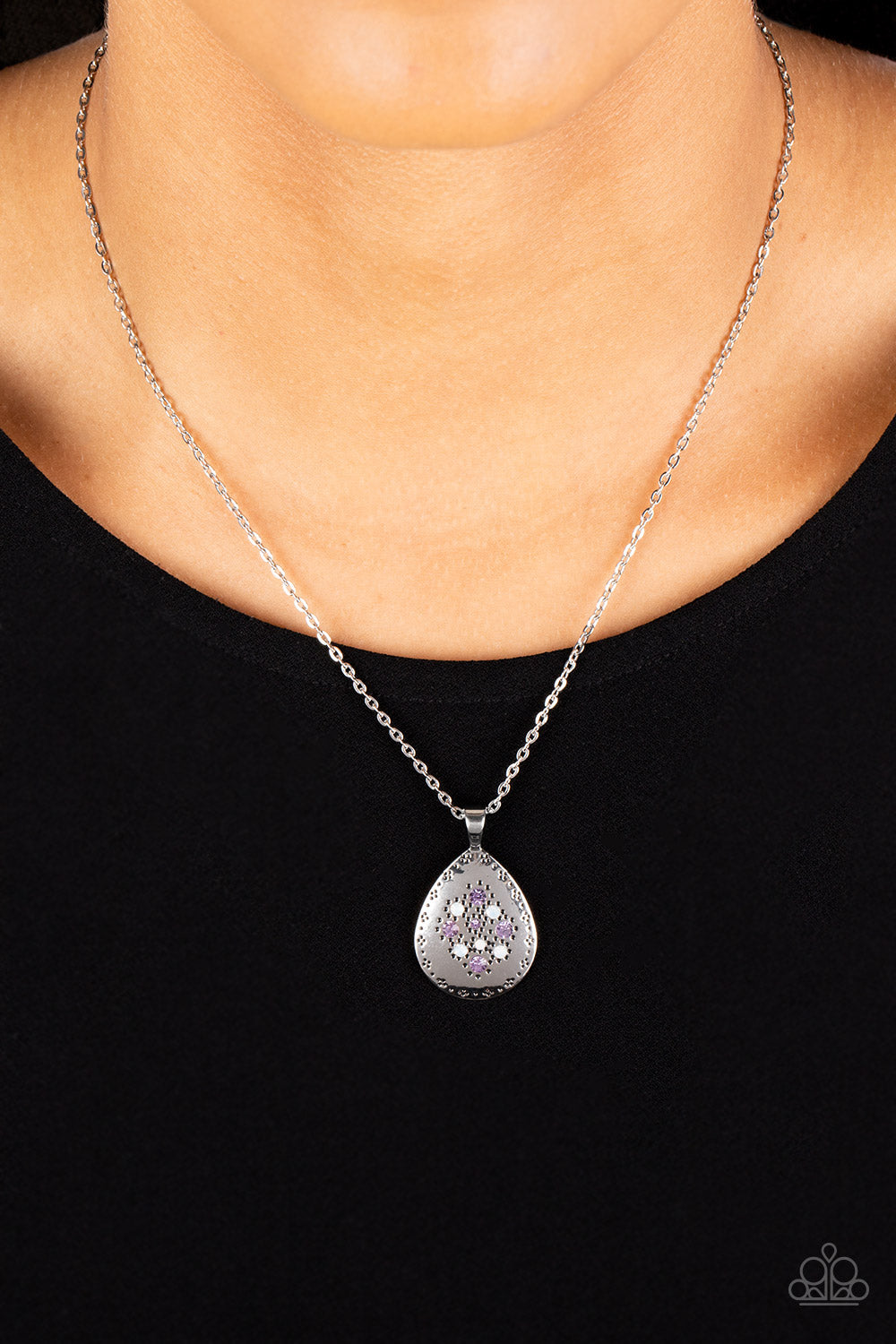 Dainty purple and opal rhinestones sparkle at the center of a silver teardrop pendant. Dotted in a subtle floral trim, the whimsical frame glides along a shiny silver chain below the collar for a seasonal look. Features an adjustable clasp closure.