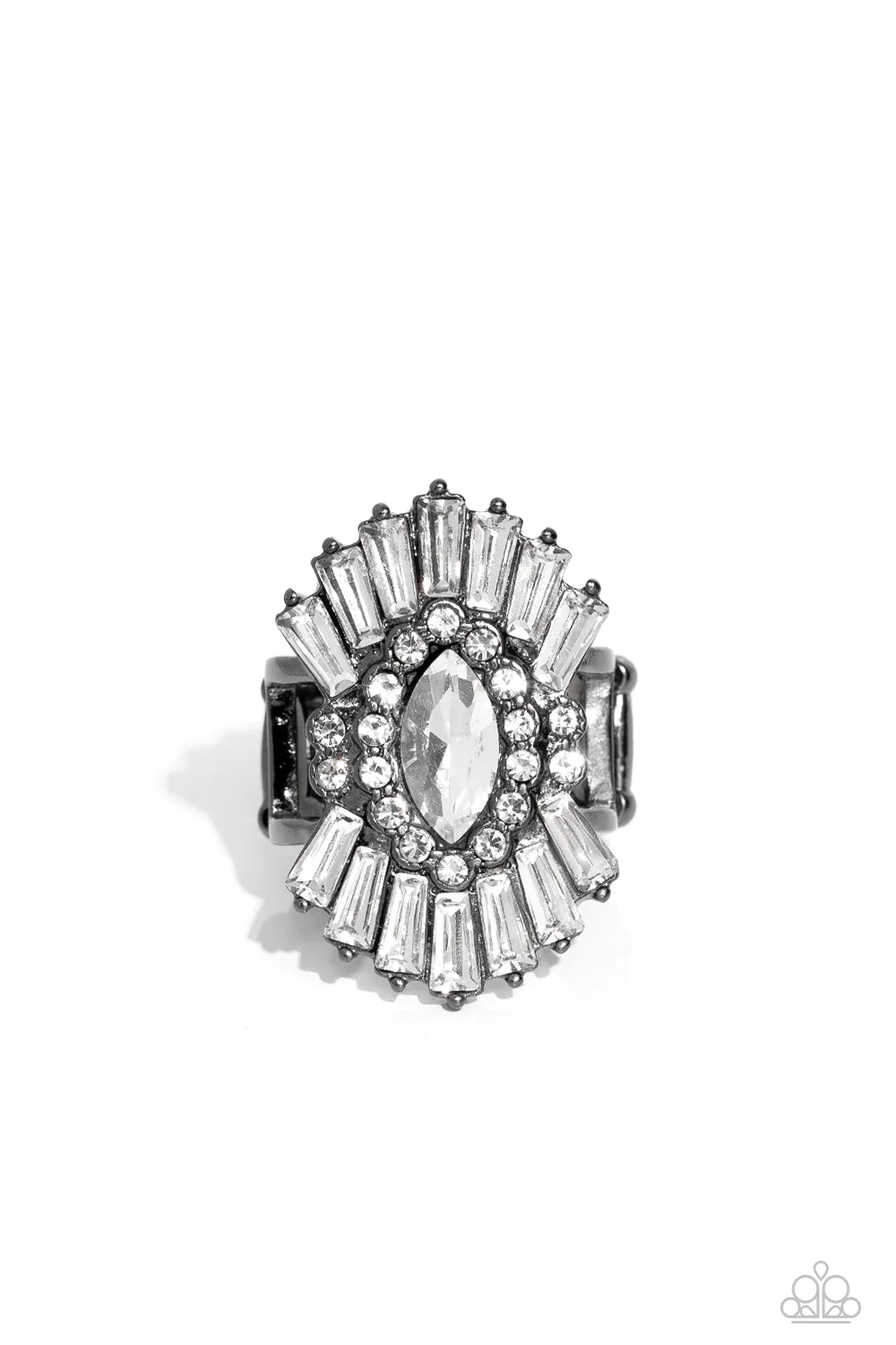 A white, marquise-cut rhinestone is bordered in glassy white rhinestones atop fans of trapezoidal-cut white rhinestones, resulting in an edgy sparkle that explodes atop the finger. Features a stretchy band for a flexible fit.