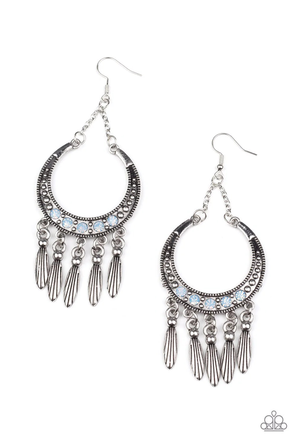 A row of blue opal rhinestones adorns the center of a studded silver half moon frame. Tassels of classic and textured silver beads cascade from the bottom of the frame, creating a dreamy fringe. Earring attaches to a standard fishhook fitting.