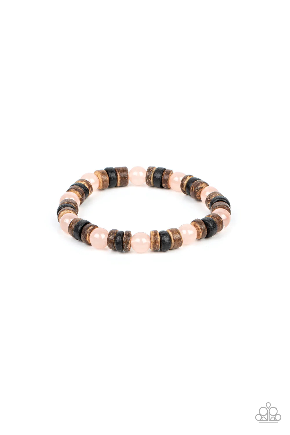 Glassy pink stone beads join trios of black and brown wooden discs along stretchy bands around the wrist, resulting in an earthy pop of color.