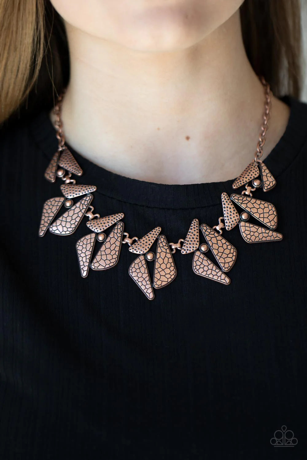 Hammered and embossed in nature inspired patterns, mismatched triangular copper and studded frames delicately link below the collar for an adventurous look. Features an adjustable clasp closure.
