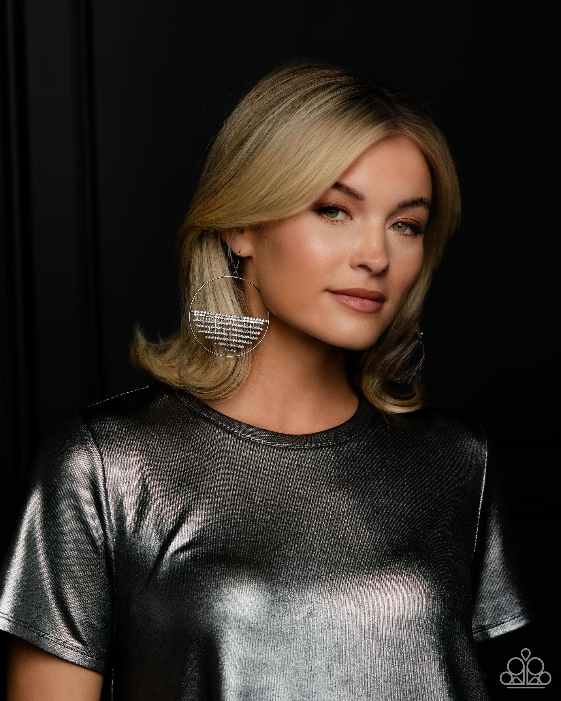 A curtain of white rhinestones is stretched between the edges of a skinny, oversized gunmetal hoop, creating a shimmering display. The rhinestones taper towards the center as they sway and cascade, adding sparkly movement for a fierce industrial finish. Earring attaches to a standard fishhook fitting.