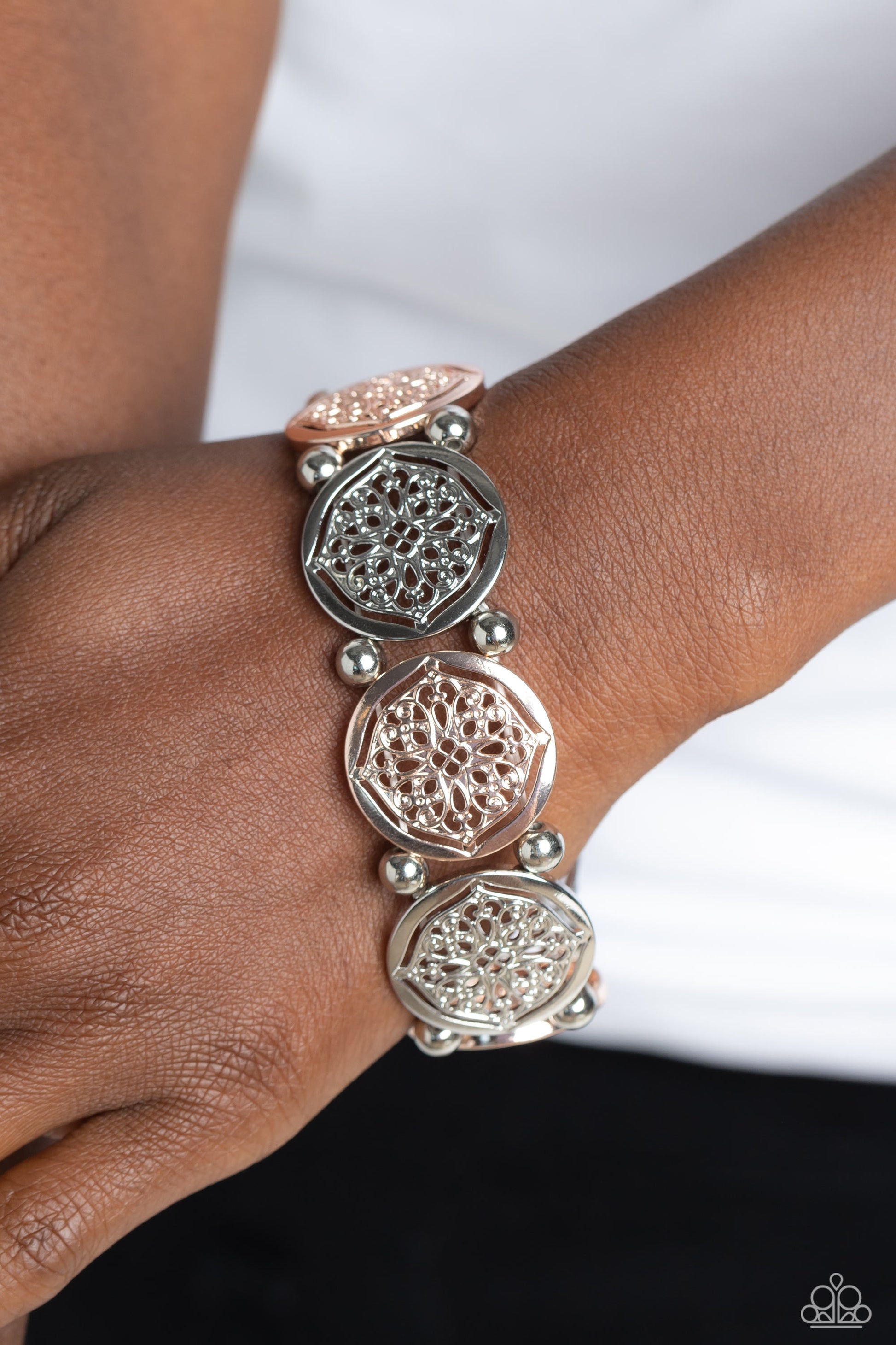 Filled with shiny floral-like filigree, a collection of glistening silver and rose gold discs links around the wrist on a stretchy band for a whimsical fashion. Silver beads separate each floral display for additional high-sheen shimmer.