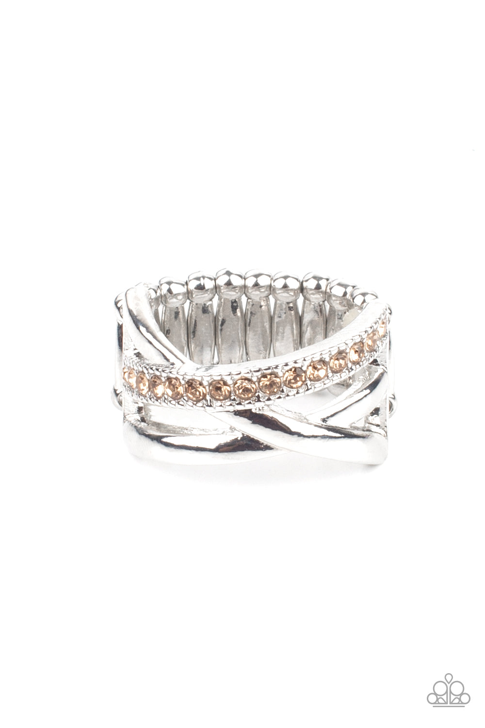 Bands of crisscrossing shining silver bars are highlighted by a row of glittering light topaz rhinestones for a ritzy finish across the finger. Features a stretchy band for a flexible fit.