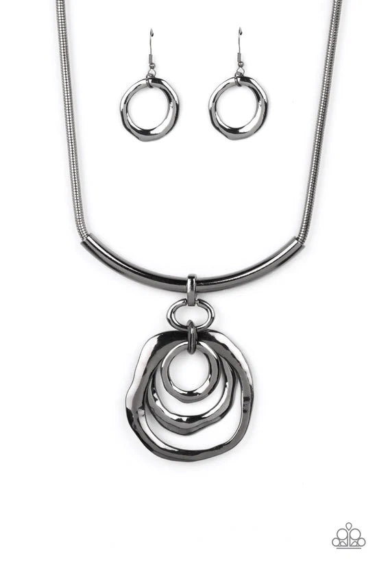 Warped gunmetal hoops glisten from the bottom of a bowing gunmetal bar set in the center of a rounded gunmetal snake chain, resulting in a contemporary centerpiece below the collar. Features an adjustable clasp closure.
