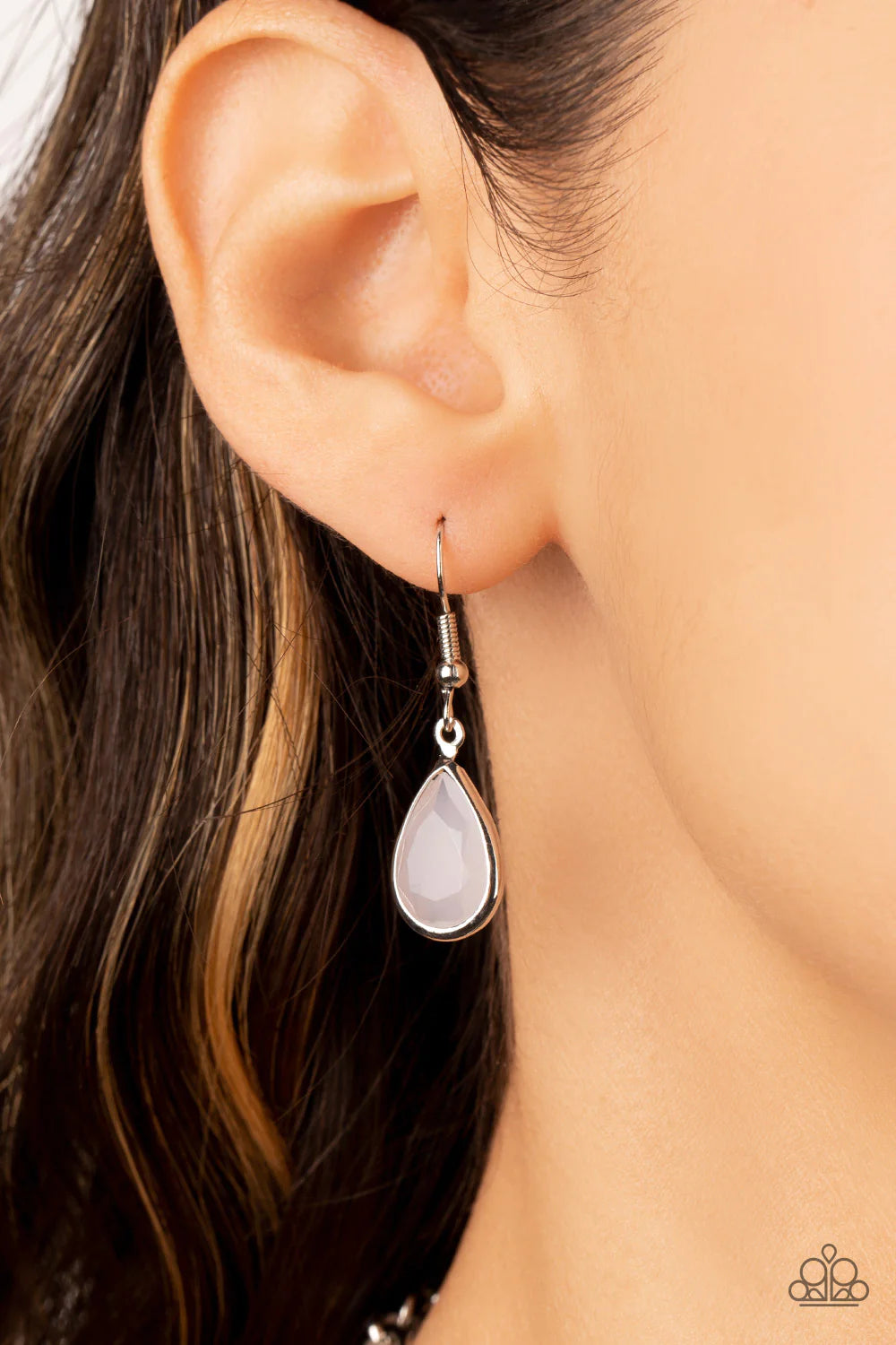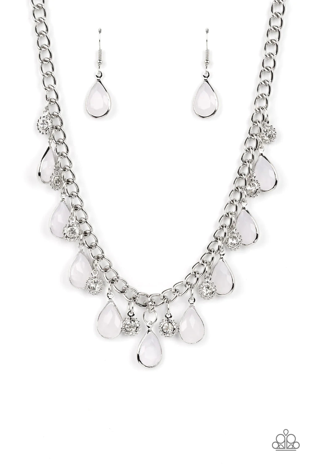 A thick silver chain is decorated in white faceted teardrops wrapped in silver frames. The opacity of the beads adds a dreamy feel to the design, while tiny silver accents dotted with white rhinestone centers add a hint of shimmer. Features an adjustable clasp closure.