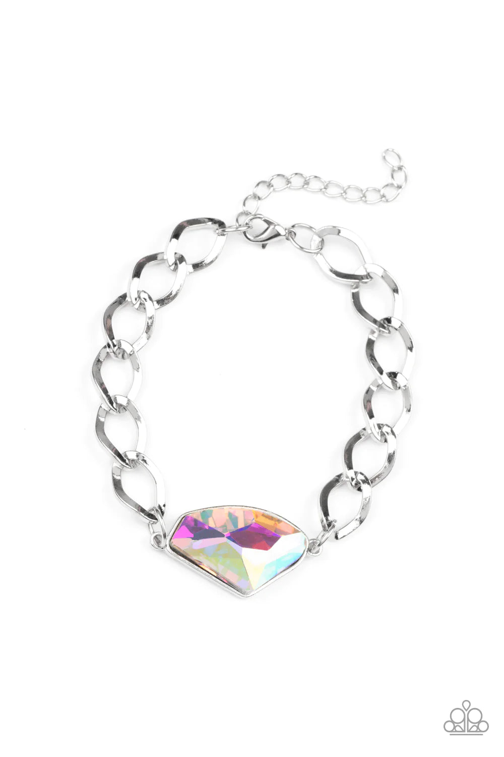 Featuring a UV shimmer, a raw cut multi gem is pressed into a sleek silver frame that attaches to a bold silver chain around the wrist for a glitzy grunge fashion. Features an adjustable clasp closure.