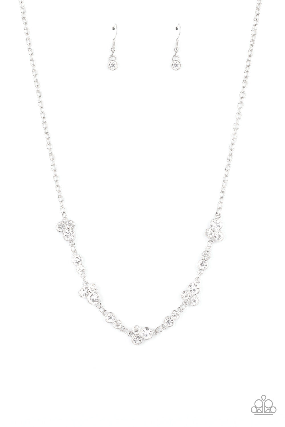 Encased in sleek silver frames, dainty pairs and trios of glittery white rhinestones delicately link into a timeless display below the collar. Features an adjustable clasp closure.