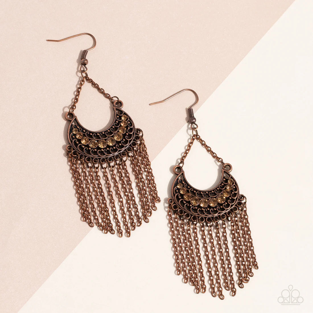 A curtain of copper chains cascades from a decorative copper half moon frame embellished in a row of topaz rhinestones, resulting in a spellbinding fringe. Earring attaches to a standard fishhook fitting.