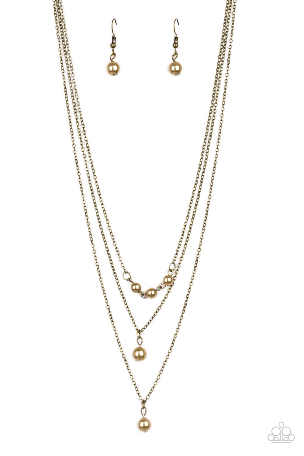 A trio of pearly brass beads give way to layers of solitaire brass pearl pendants below the collar for a refined flair. Features an adjustable clasp closure.