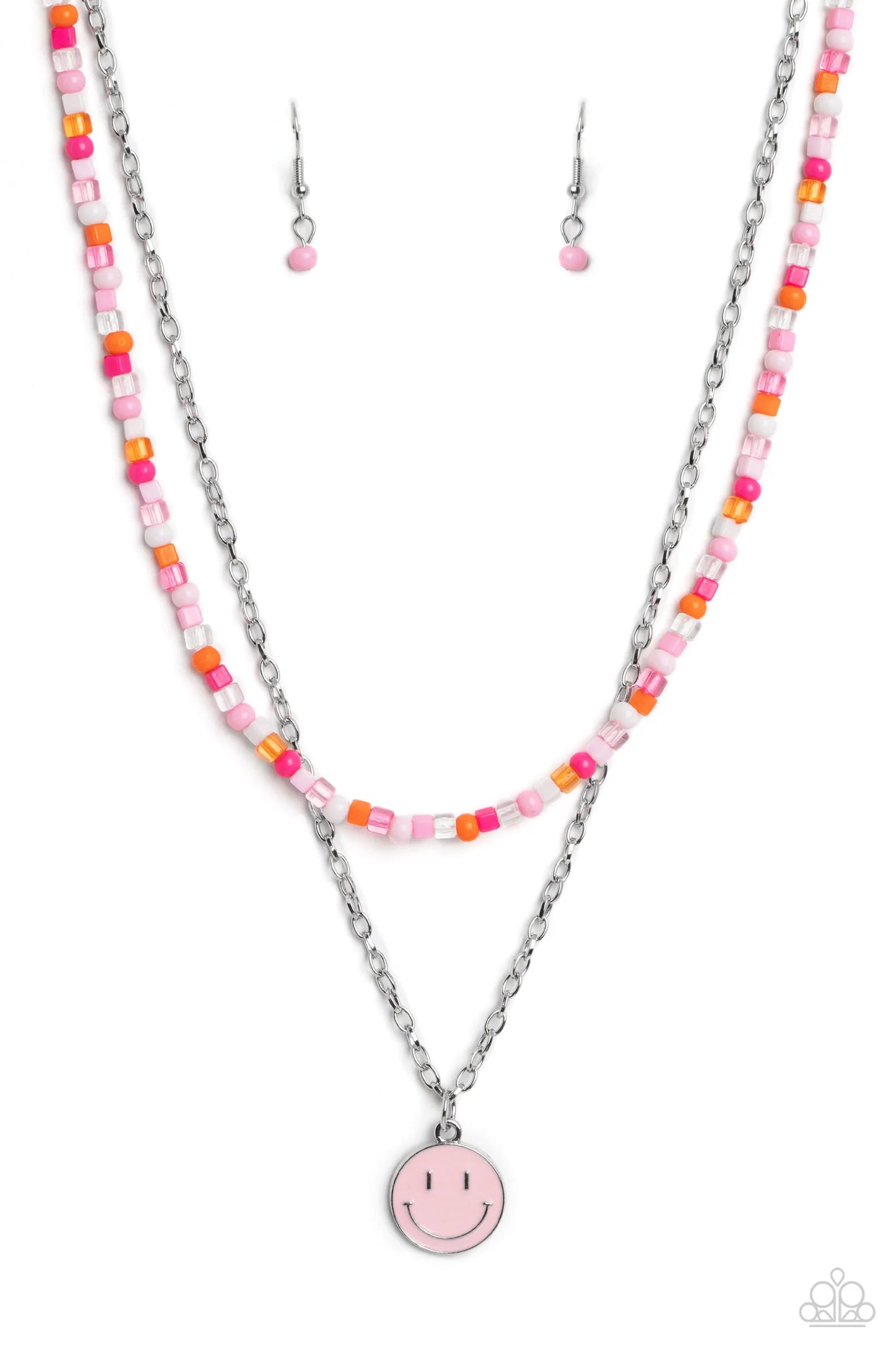 smiley face pendant stands out against a pink backdrop. Completing the charismatic ensemble, a collection of seed beads in shades of light pink, white, pink, orange, and hot pink create bright pops of color around the neckline for a youthful finish. Features an adjustable clasp closure.
