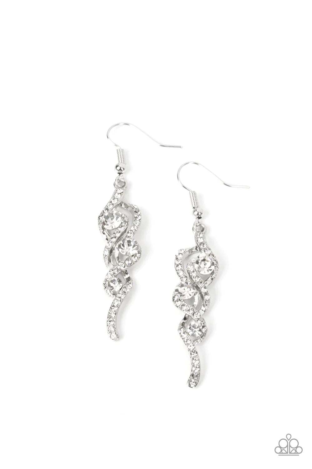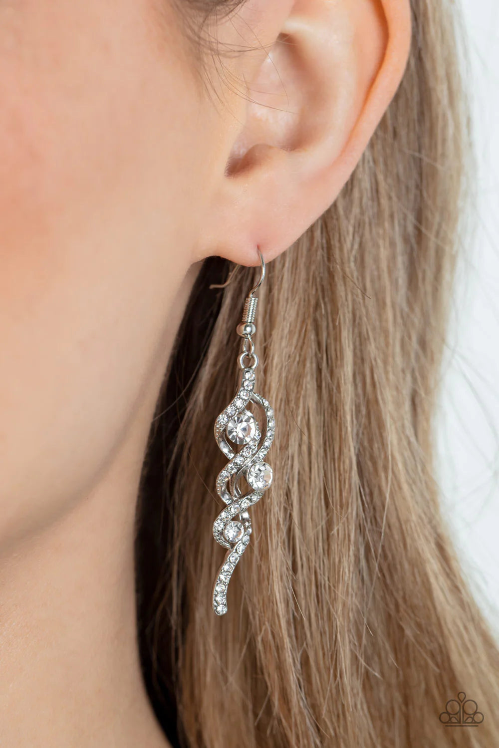Radiant rivulets of dainty white rhinestones twirl around solitaire white rhinestones, whirling into a silvery flame for a fiery finish. Earring attaches to a standard fishhook fitting.