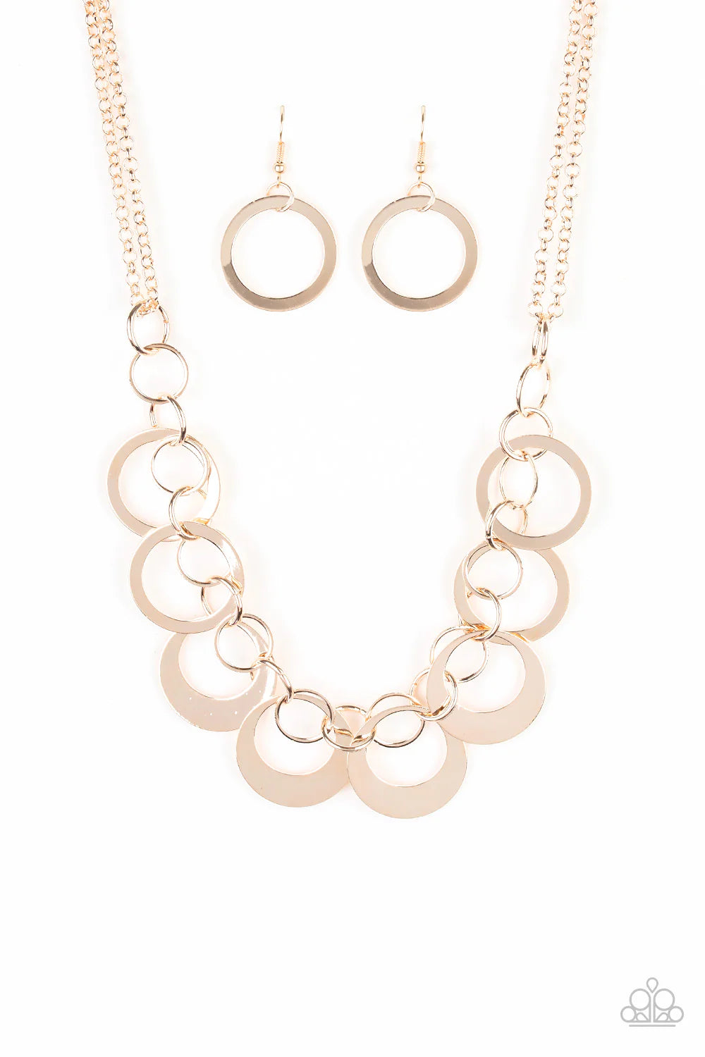 A collection of rose gold links and shiny rose gold hoops connect below the collar, creating a refined fringe. Features an adjustable clasp closure.