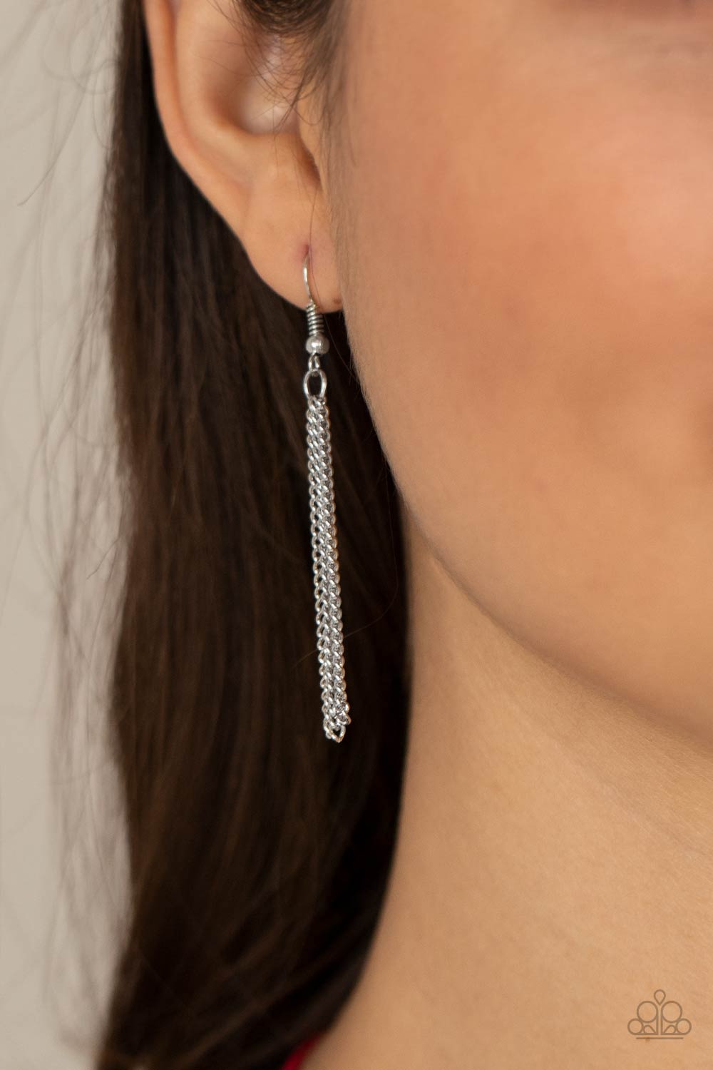A bold silver ring gives way to two interlocking half moon silver frames at the bottom of a lengthened piece of red suede. Shimmery silver chains swing from the bottom of the display, adding flirty movement to the stationary pendant. Features an adjustable clasp closure.