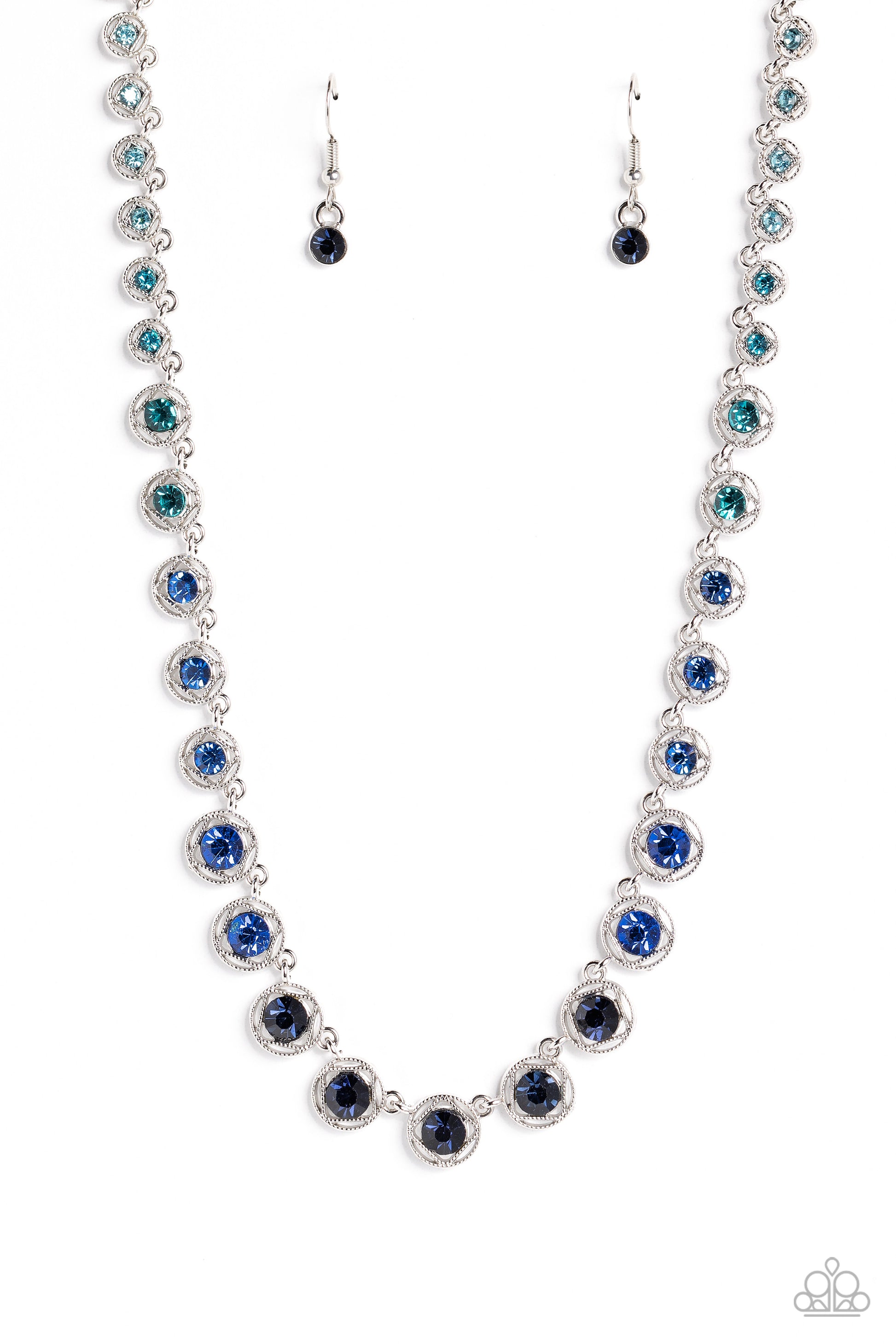 Spanning around the entirety of the neckline, a refined collection of rhinestones in shades of blue are pressed into airy, studded, silver square frames, tilted on their sides for a three-dimensional shimmer. The frames and rhinestones gradually increase in size as they fall down the neckline, accentuating their colorful sparkle. Features an adjustable clasp closure.