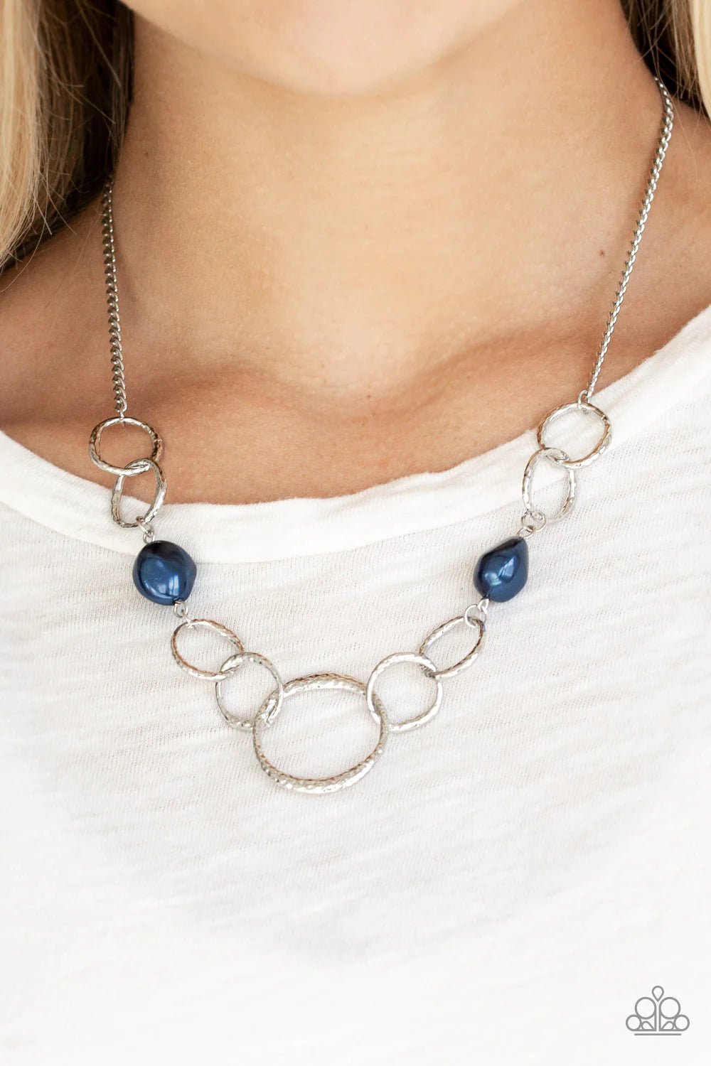 Pearly blue pebbles join with delicately hammered silver rings below the collar for a refined flair. Features an adjustable clasp closure.