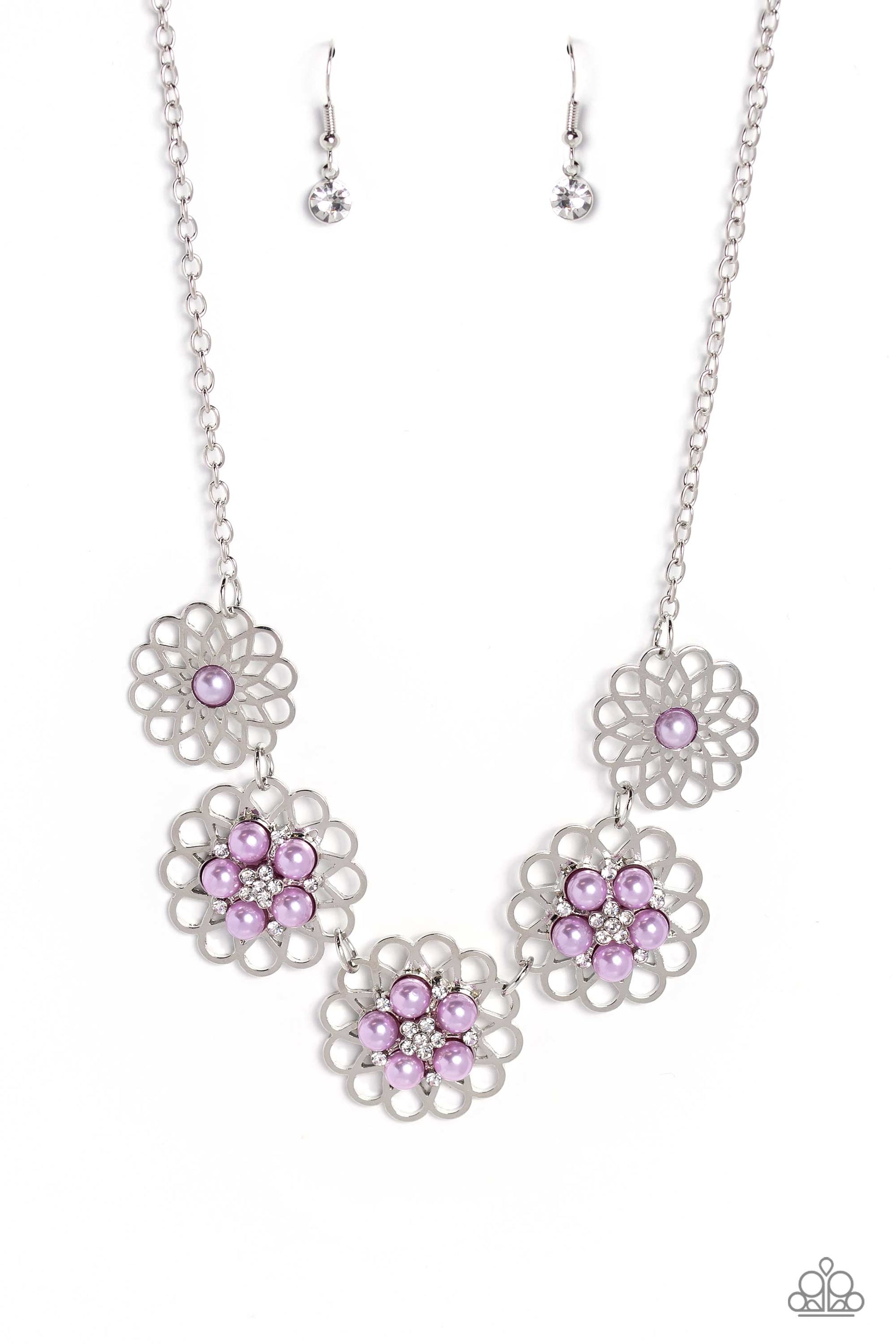Gleaming silver flowers with airy filigree petals are dotted with dainty white rhinestones and lavender pearl centers for a refined design. The lavender pearls and dainty white rhinestones form into a smaller flower motif on three of the silver flowers for additional whimsy. Features an adjustable clasp closure.