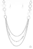Faceted white beads and hammered silver hoops give way to layers of mismatched silver chains for a whimsical look. Features an adjustable clasp closure.