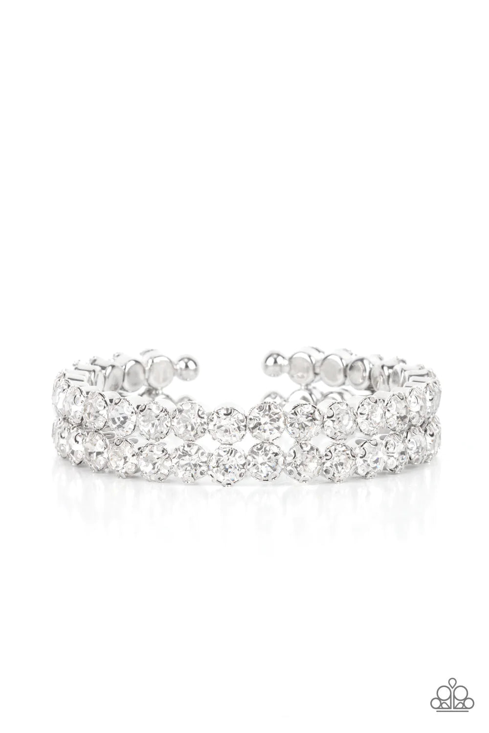 Encased in sleek silver fittings, two oversized rows of glassy white rhinestones stack into a blinding cuff around the wrist for a jaw-dropping look.