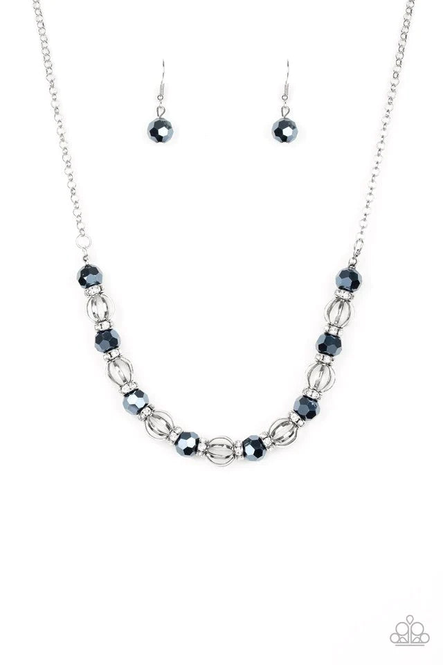A collection of airy silver beads, faceted blue metallic beads, and white rhinestone encrusted rings are threaded along an invisible wire below the collar for a statement-making fashion. Features an adjustable clasp closure. Sold as one individual necklace. Includes one pair of matching earrings.