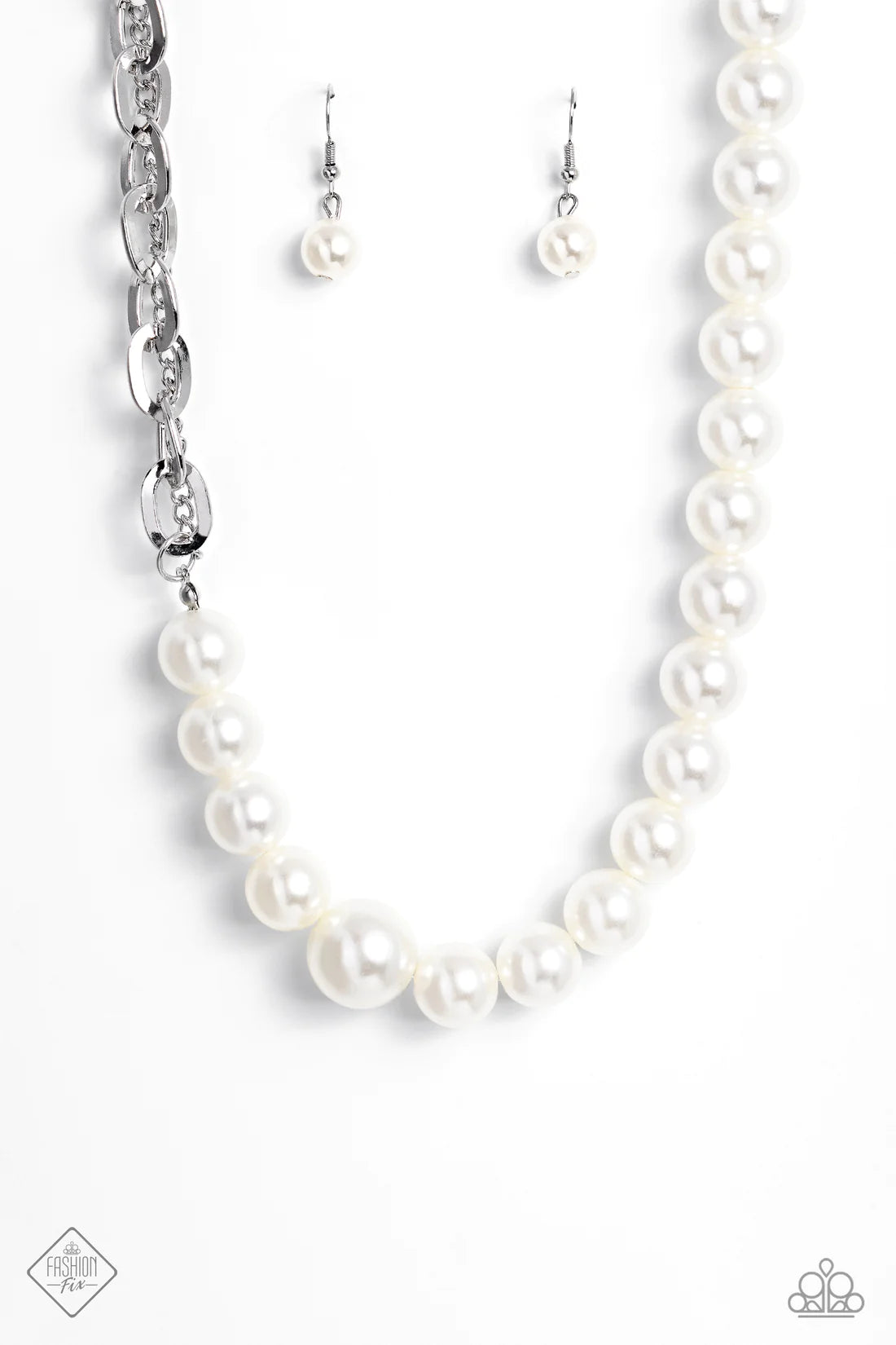 A strand of white pearls collides with layers of chains to create an abstract blend of grit and glitz. The oversized links of the curb chain offset the pearly sheen of the beads that lay on the opposite side, perfectly balancing the contrasting design. Features an adjustable clasp closure.