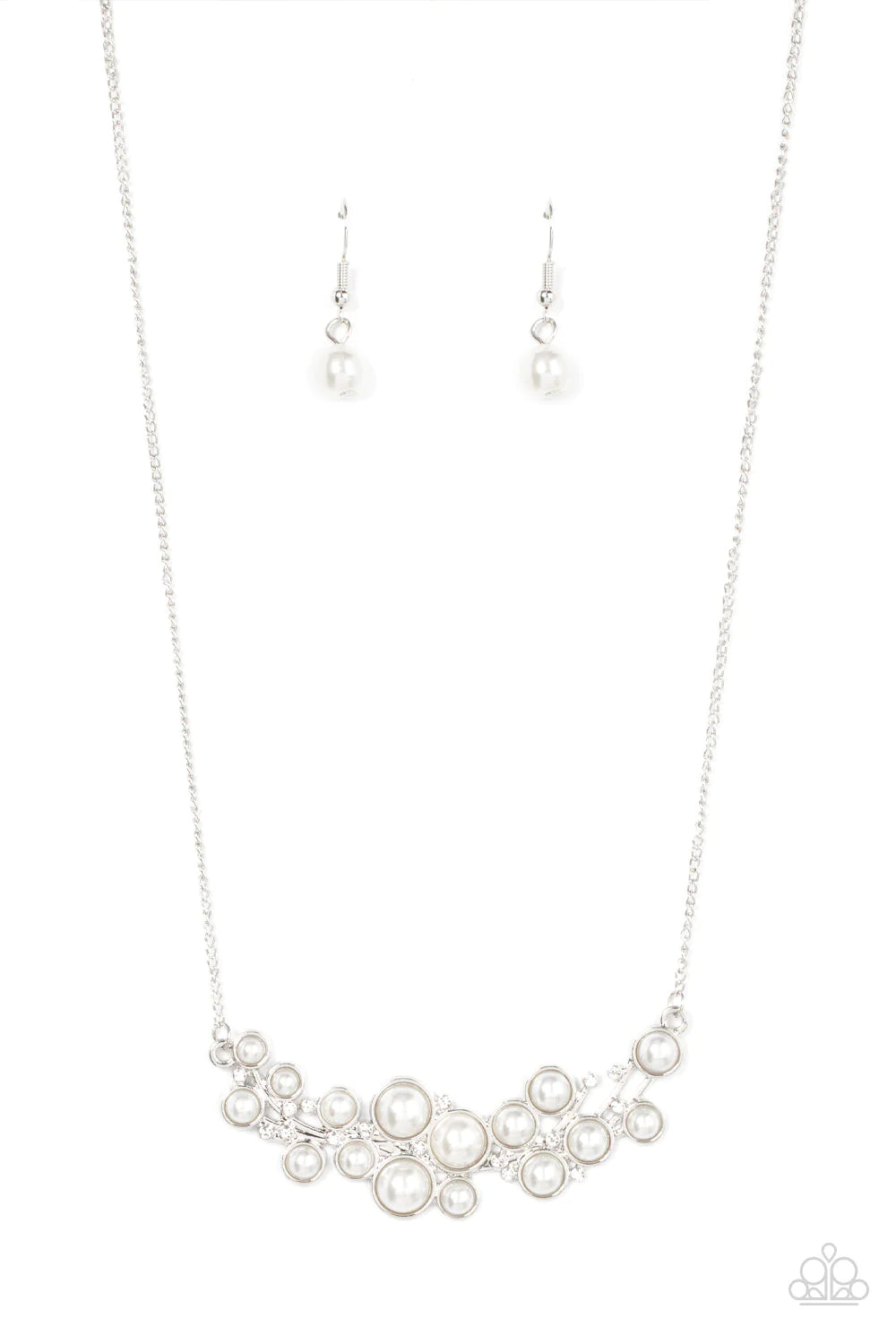 A bubbly explosion of white pearls and glassy white rhinestones delicately coalesces into an effervescent collared pendant between two dainty silver chains. Features an adjustable clasp closure.