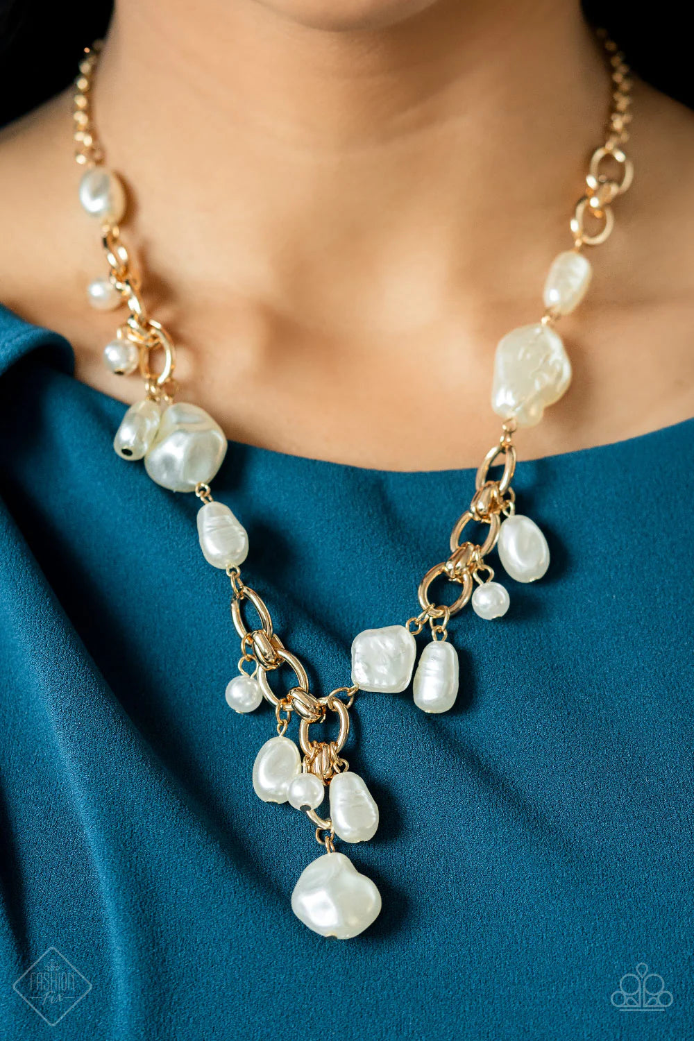 A modern collection of asymmetrical pearly white beads adorn sections of a chunky gold chain below the collar. Matching pearly beads sporadically trickle from the chain, resulting in a timelessly tasseled display. Features an adjustable clasp closure.
