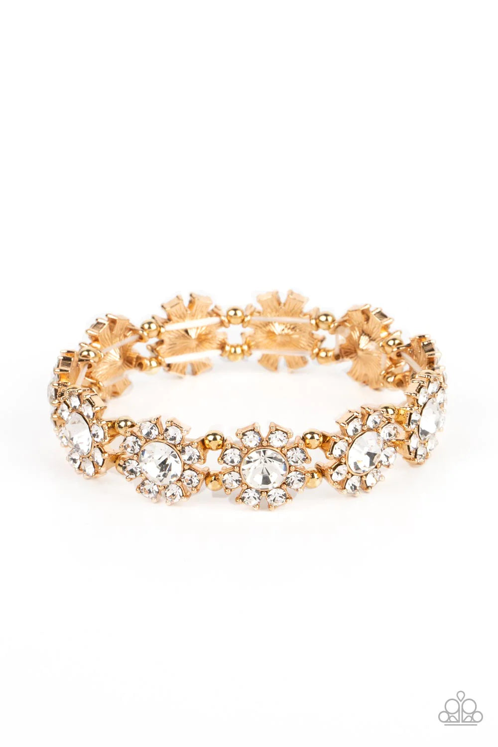 Separated by pairs of dainty gold beads, rhinestone-dotted petals bloom from oversized white rhinestone centers along stretchy bands around the wrist for a flirtatious floral fashion.
