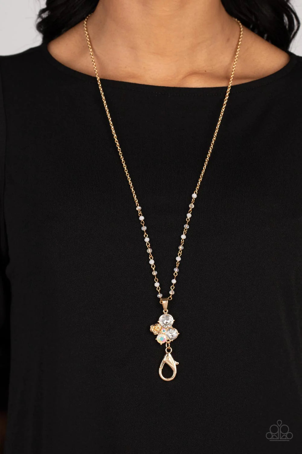 Varying in size and shimmer, rhinestones brushed in an iridescent shimmer and glittery white rhinestones coalesce into a clustered pendant at the bottom of a shimmery gold chain. A metallic gold rose blooms within the pendant, adding a touch of floral flair to the design, as dainty white opaque beads and reflective crystal-like beads decorate the lower part of the elongated gold chain in an elegant finish. A lobster clasp hangs from the bottom of the design to allow a name badge or other item to be attached. Features an adjustable clasp closure. Due to its prismatic palette, color may vary.