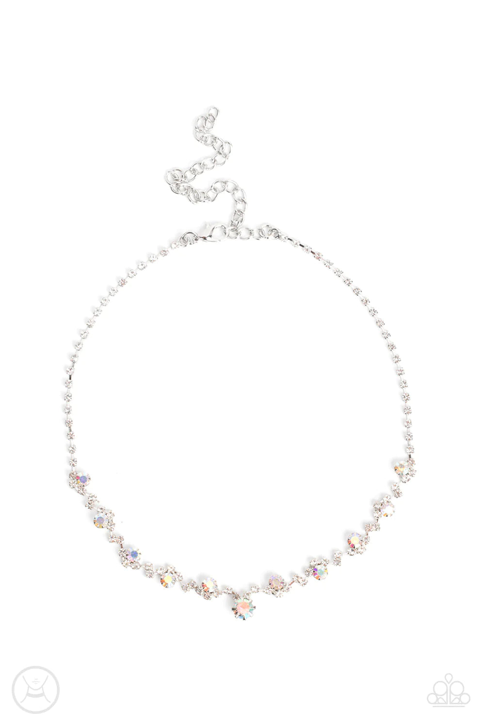 Featuring pronged silver fittings, pairs and clusters of dainty white and iridescent rhinestones delicately connect to a strand of icy white rhinestones around the neck for a regal attitude. Features an adjustable clasp closure.