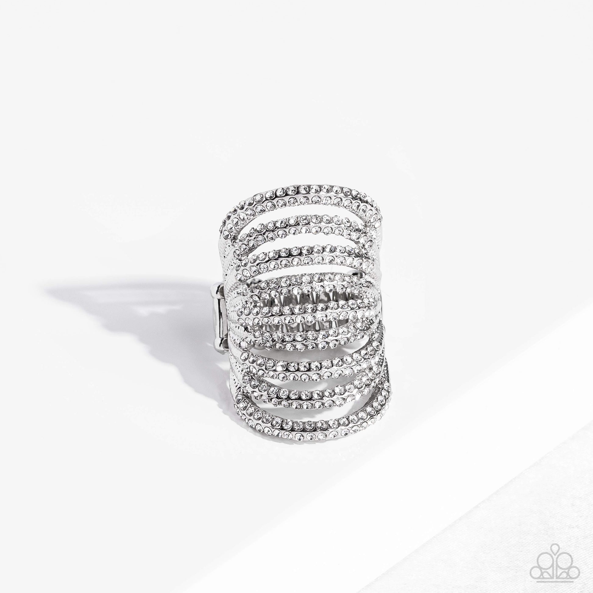 An elongated silver frame, lined with dainty white rhinestones, creates the illusion of endless sparkle as it stacks up the finger. Encrusted in two rows across each silver band as it arcs across the finger, the high sheen finish creates a stunning backdrop for the rhinestones, allowing the skin to peek through the airy bands for a whimsical finish. Features a stretchy band for a flexible fit.
