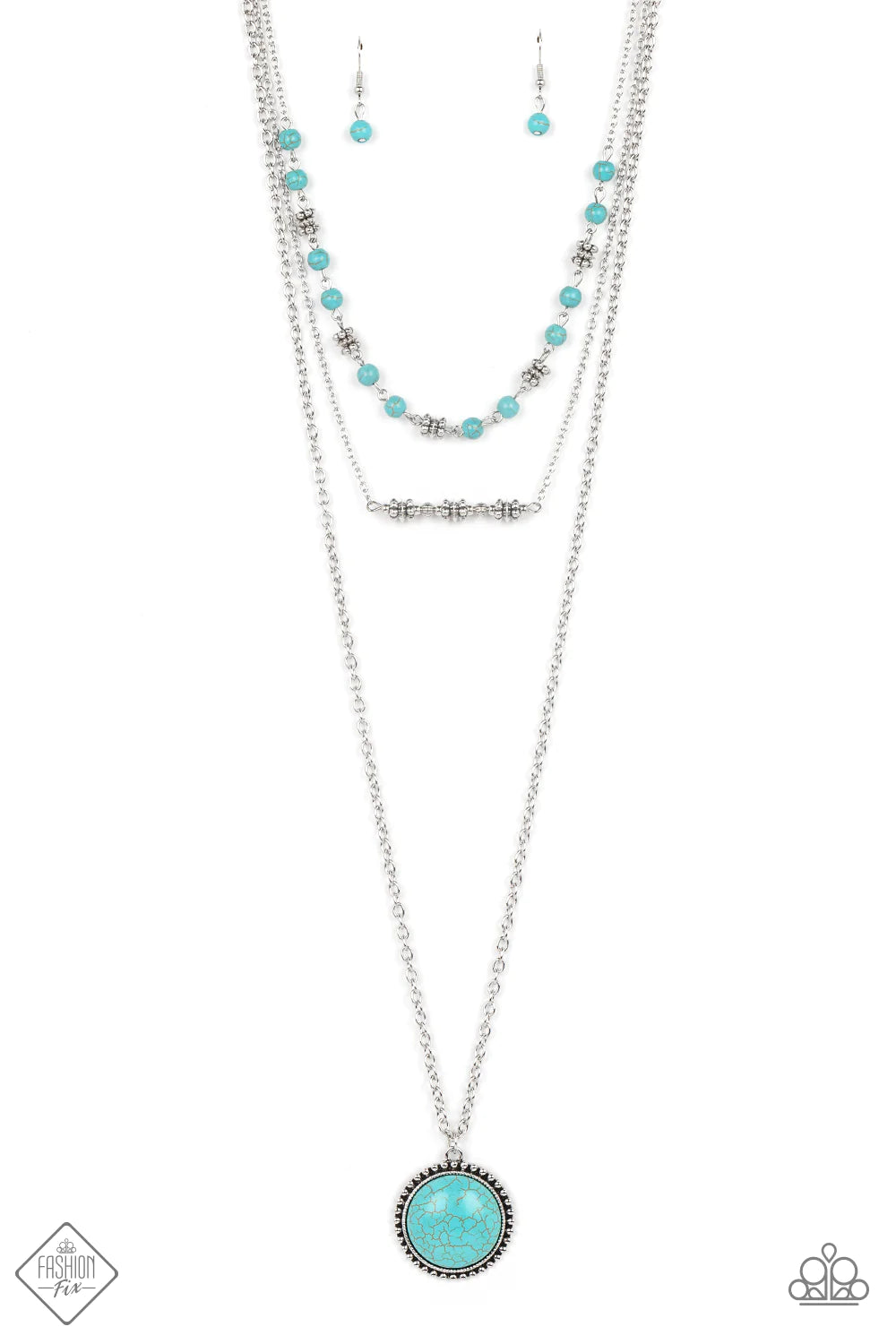 A round turquoise stone, set in a studded antiqued silver frame, creates a bold pendant at the bottom of a lengthened silver chain. This earthy statement piece is accompanied by layered strands of turquoise beads and antiqued silver accents that connect to dainty silver chains making a charming layered design. Features an adjustable clasp closure.
