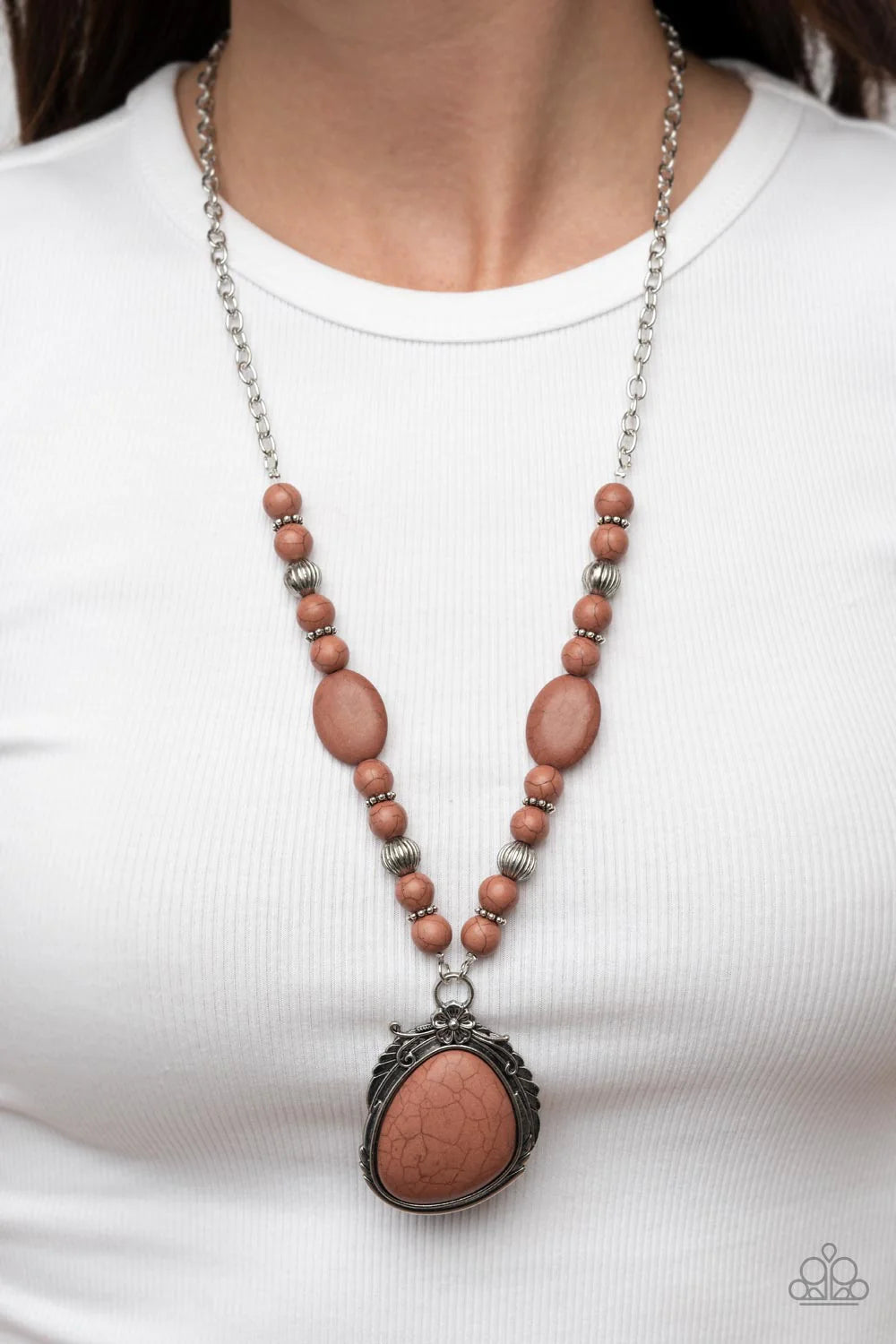 A lengthened silver chain flows into a succession of polished brown stone beads and silver accents. The flowy display gives way to an opulent brown stone that is pressed into an ornate silver frame. Adorned with fanciful antiqued silver flower, vine, and feather-like motifs, the elegantly rustic pendant makes a striking impact. Features an adjustable clasp closure.