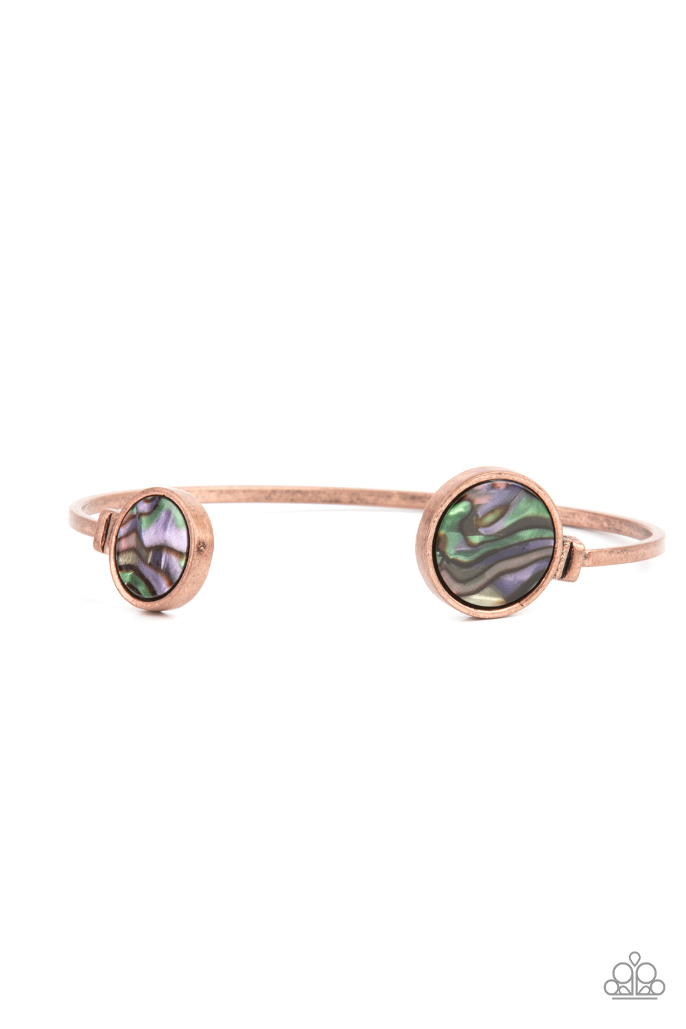 Encased in antiqued copper frames, iridescent multicolored shell-like fittings adorn the ends of a dainty copper cuff, creating a colorful open-face display.