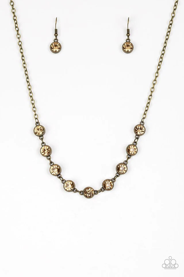 Encased in studded brass frames, golden topaz rhinestones link below the collar for a glamorous look. Features an adjustable clasp closure. Sold as one individual necklace. Includes one pair of matching earrings.