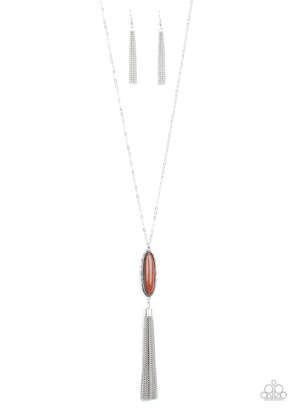 A shimmery silver tassel streams from the bottom of a glittery orange beaded pendant, creating a dazzling look at the bottom of a lengthened silver chain. Features an adjustable clasp closure.