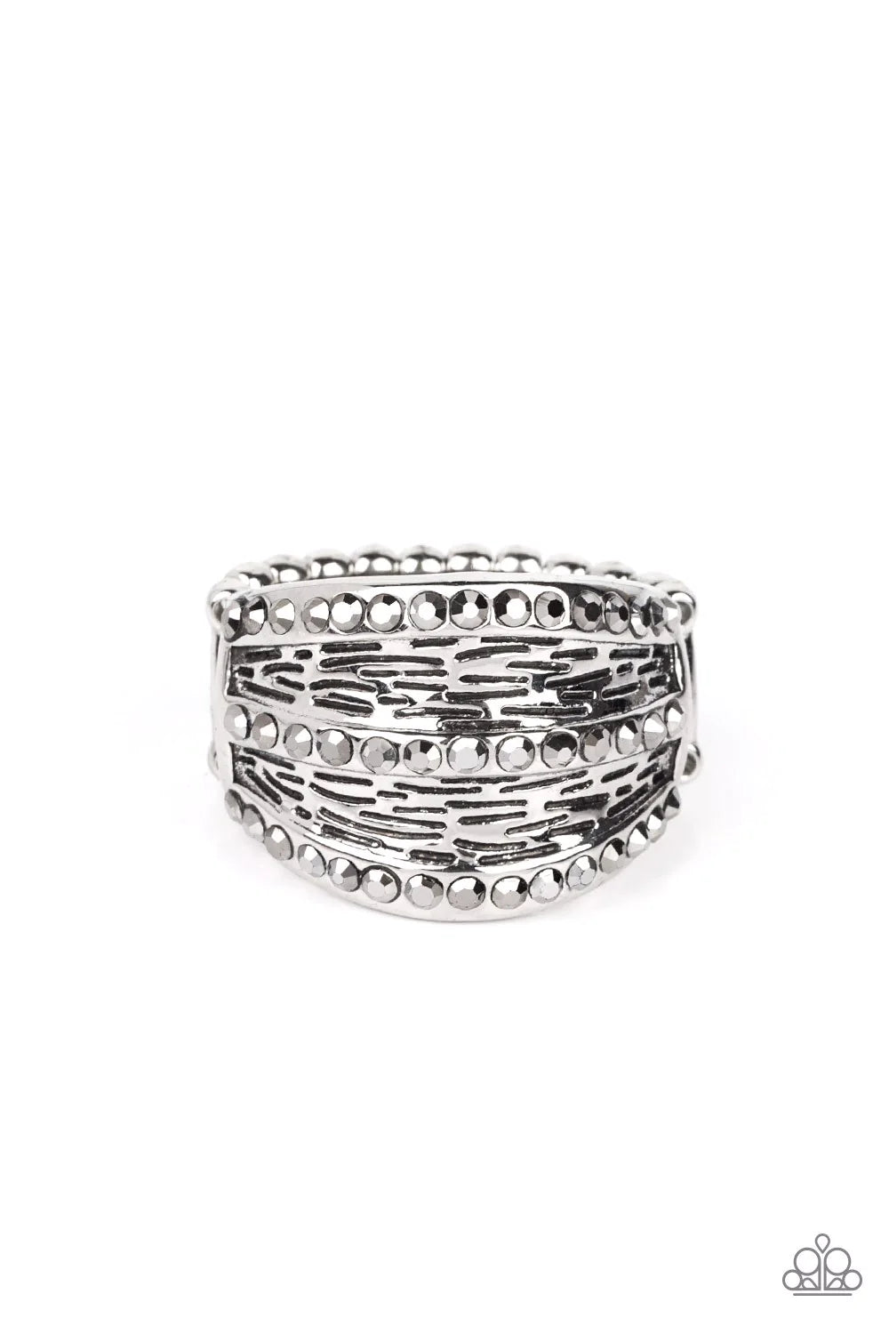 A wide silver band is etched in a subtle texture in a brick lay pattern and topped with three rows of sparkling hematite, resulting in a sultry centerpiece. Features a stretchy band for a flexible fit.