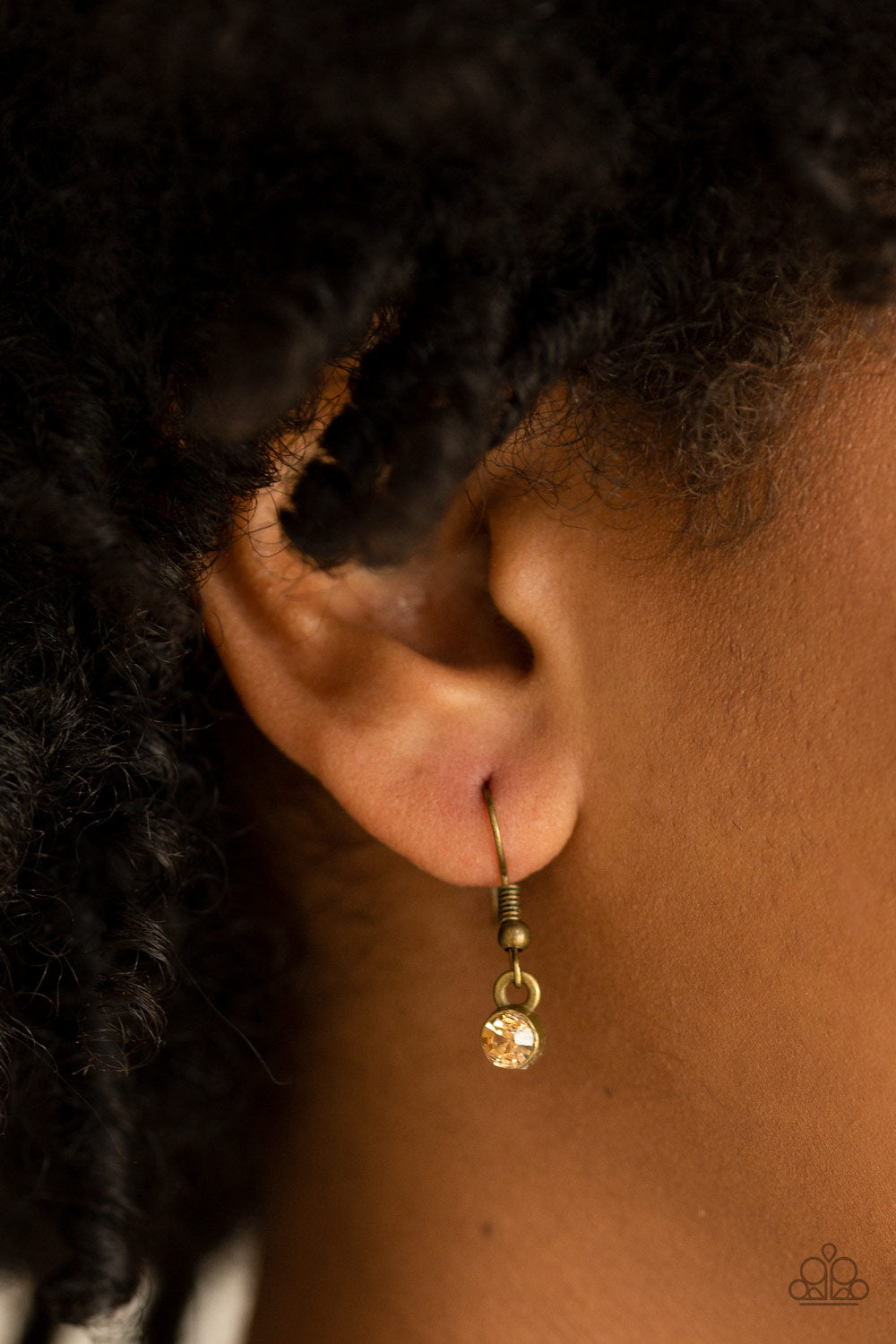 A topaz rhinestone encrusted square, a shimmery brass square, and a glowing brown moonstone tumble down the chest, coalescing into a stylish pendant. Features an adjustable clasp closure.