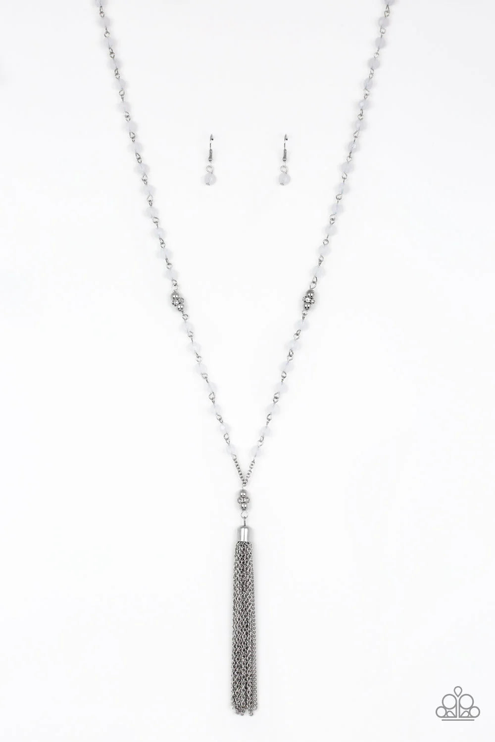 White opaque crystal-like beads, shiny silver beads, and white rhinestone encrusted rings give way to a shimmery silver tassel for a whimsical look. Features an adjustable clasp closure.