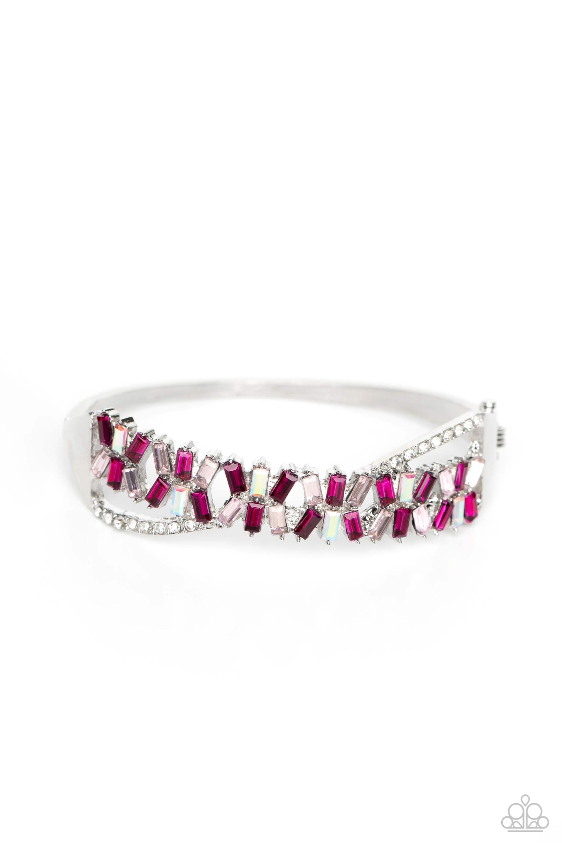 Modeled after the infinity symbol curves, a row of dainty white rhinestones playfully interacts with emerald-cut gems splashed in shades of fuchsia, pink, and iridescence. Set in clusters of three, the emerald-cuts haphazardly stack on top of one another for a timeless, geometric radiance atop the wrist. Due to its prismatic palette, color may vary. Features a hinged closure.