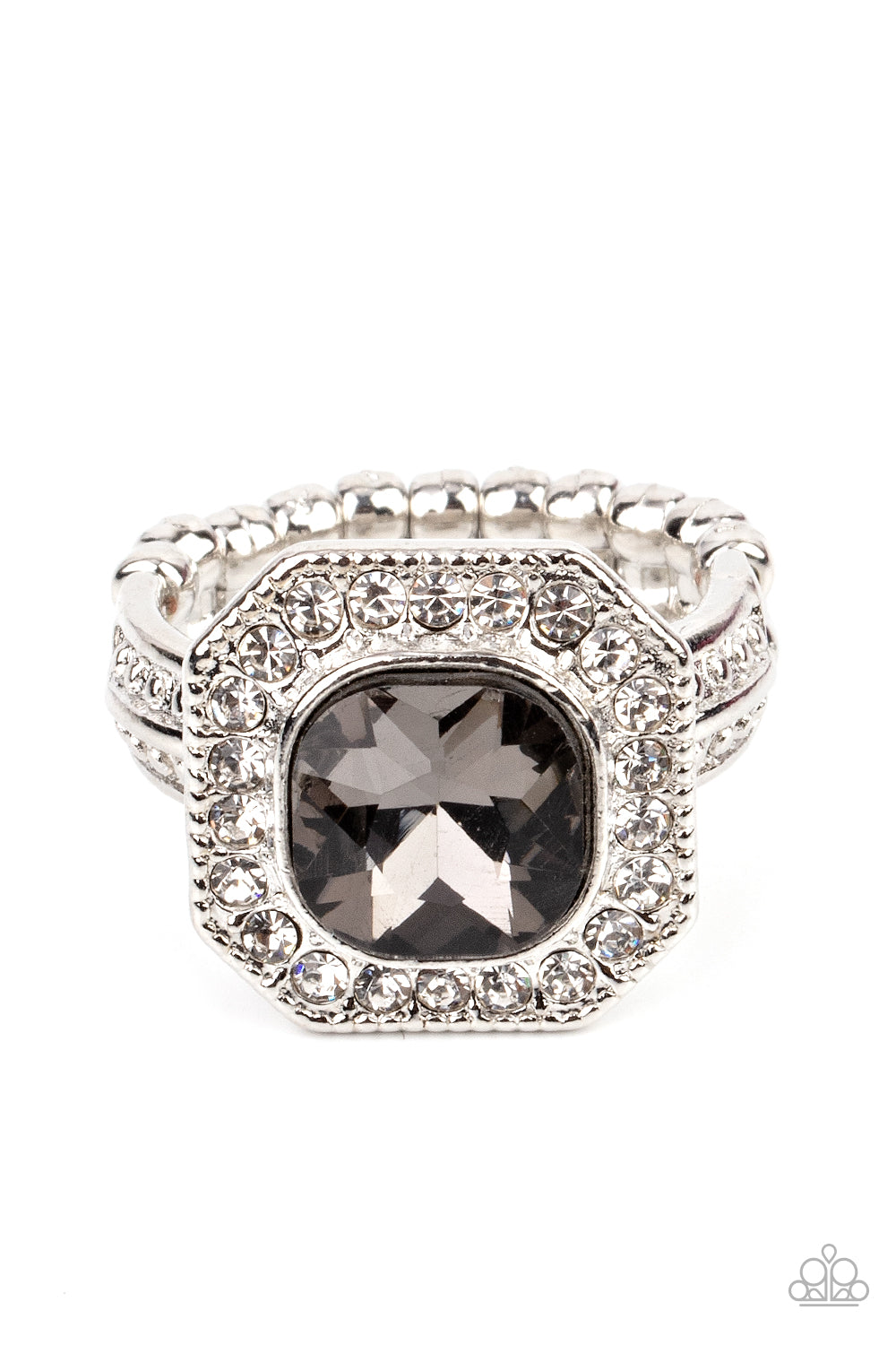 Bordered in a sparkly silver frame of glassy white rhinestones, an oversized smoky gem adorns the finger for a timeless finish. Features a dainty stretchy band for a flexible fit.