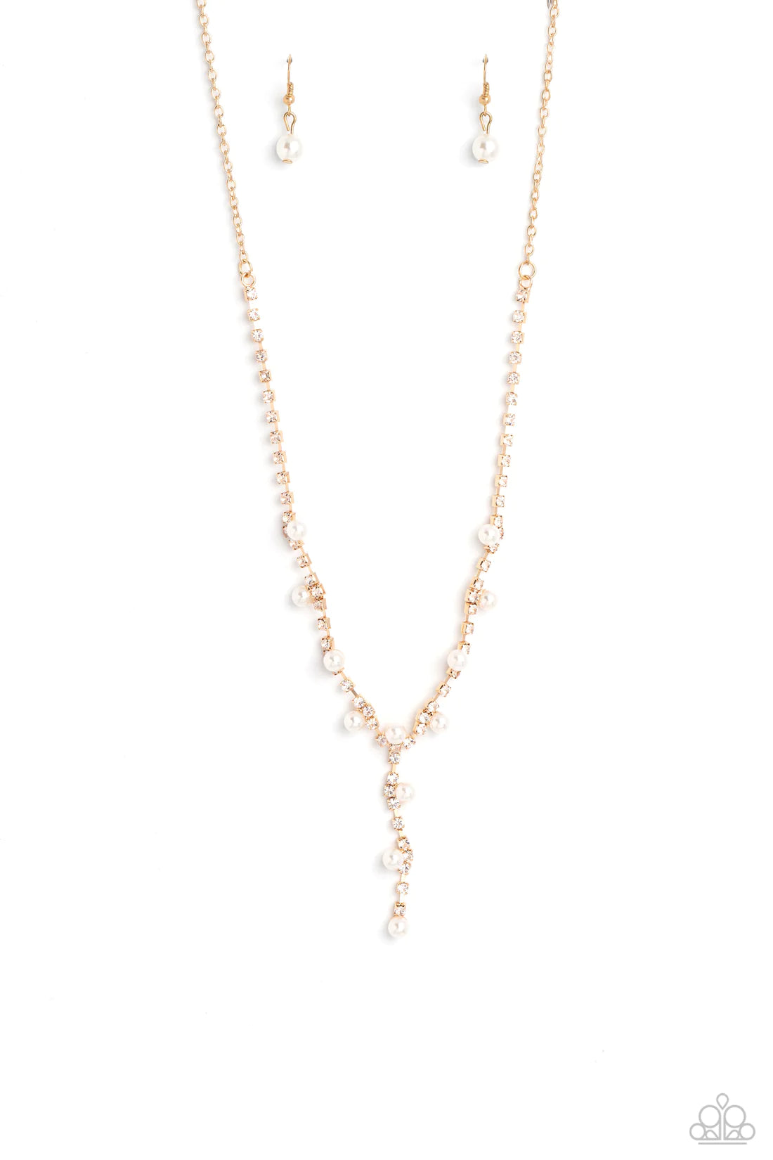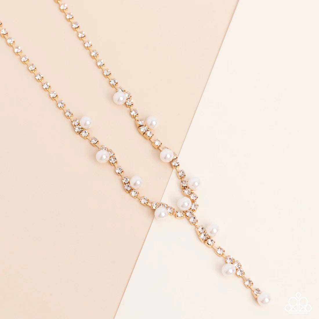 Attached to a section of dainty gold links, white rhinestones, pressed into shiny gold box chain fittings swing down the neckline in a lariat-like manner for an effulgent glow. Sporadically infused along the box chain fittings, high-sheen white pearls adorn the sparkly display for additional refinement and class. Features an adjustable clasp closure.
